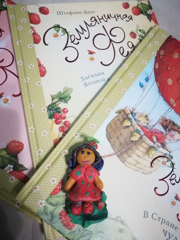 Для начала небольшое предисловие. Я показала Ксюше пост с розыгрышем выходного дня и попросила ее нарисовать фею Земляничку для участия в розыгрыше. Дочке очень понравились иллюстрации, она нарисовала две феи в разных нарядах, а потом и слепила ее из пластилина по картинке. Я создала пост, послушать мнения по поводу этой серии и с каких книг стоит начинать знакомство с ней. В серии вышло уже семь книг. При этом, первые три (речь о которых пойдет ниже) содержат в себе одну длинную историю про фею Земляничку, а остальные четыре- сборник коротких историй про фею. Разный и объем страниц в книгах, в первых трех-32 страницы, в остальных -48 страниц.