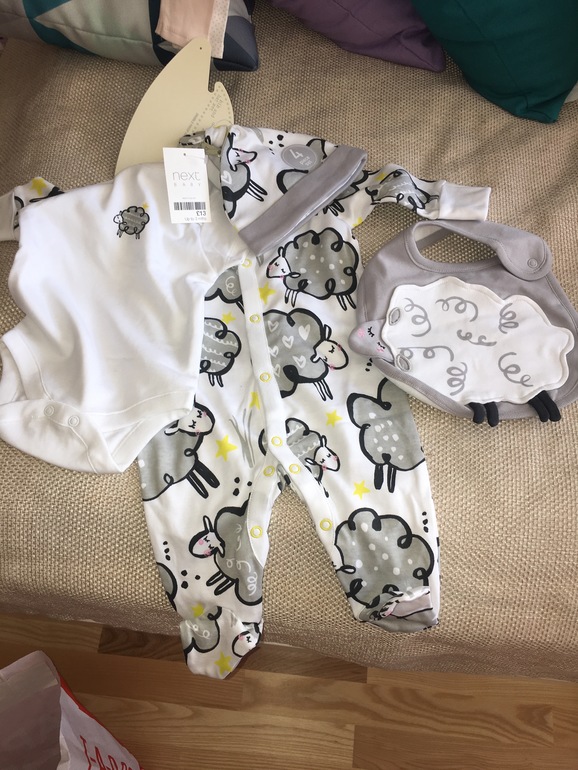 Этот принт очень папе нашему нравится)))мы даже ночник в виде овечки заказали, только он пришёл разбитый((((а на фото 2 комплектика: боди, слипик, шапочка, и два слюнявчика)