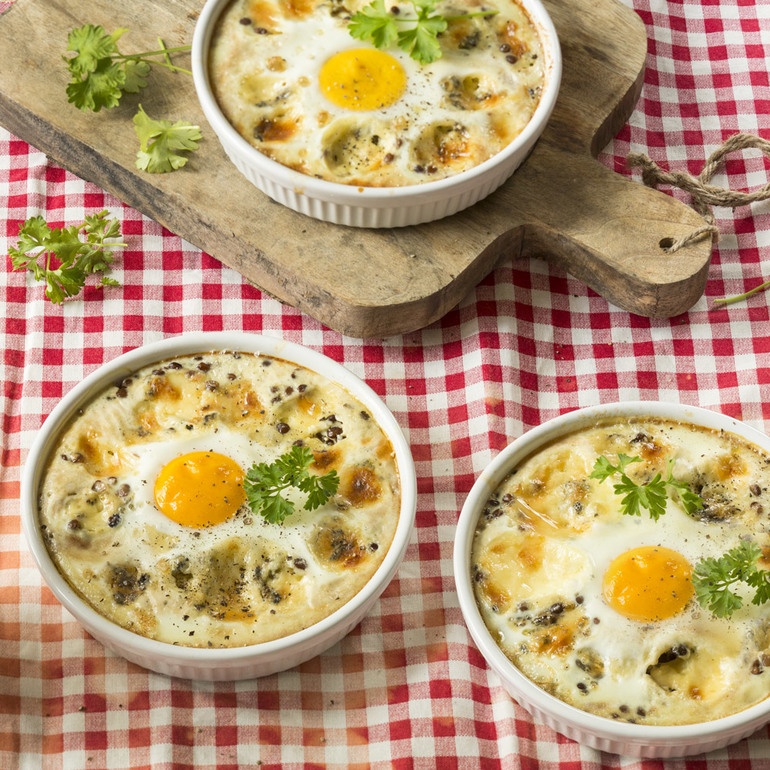 Равномерно разложите чечевицу "на пару" бондюэль по четырем порционным формочкам. Нарежьте сыр 60 г крупными кубиками, выложите в формочки по кругу формы. Залейте в формочки сливки 30% 100 мл. В центр формы аккуратно влейте яйца 4 шт, не повредив желтки. Запекайте в предварительно разогретой до 200 °C духовке в течение 15 минут. При подаче посыпьте блюдо черным молотым перцем и украсьте веточками петрушки.