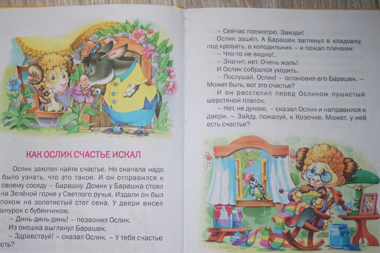 "Как ослик счастье искал" Е.Карманов ( На вопрос "Что такое счастье?" Лиза уже давно отвечает : " Я,Аня и Люда"))))) А здесь пришлось объяснять, что счастье у всех разное. Думаю, что сказка для детей старше 5 лет).