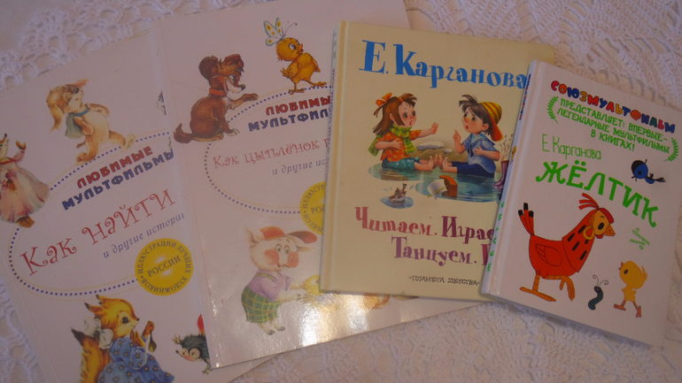 В прошлом году у нас была очень популярная Карганова, но вот эта библиотечная книга оказалась не очень удачной. Серия называется "Малышки на книжка", но есть развороты без иллюстраций.....