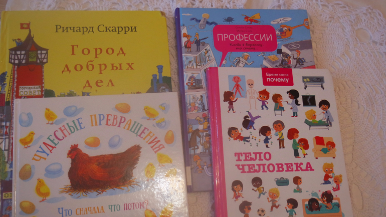 Еще были книги А.Лингред. Интересно только старшей дочке (4 года), некоторые истории не были прочитаны(((, а некоторые перечитаны по 20 раз!!!Особенно полюбились сказки про куколку и кукольный домик!!!!Моя доченька очень смешная, она играла на картинке пальчиками, воображая, что пальчики это дети и мама)))) Сейчас она играет во всех книгах пальчиками, особенно "Город добрых дел"😊
