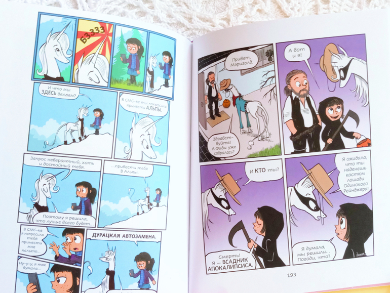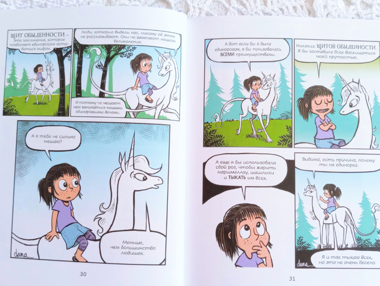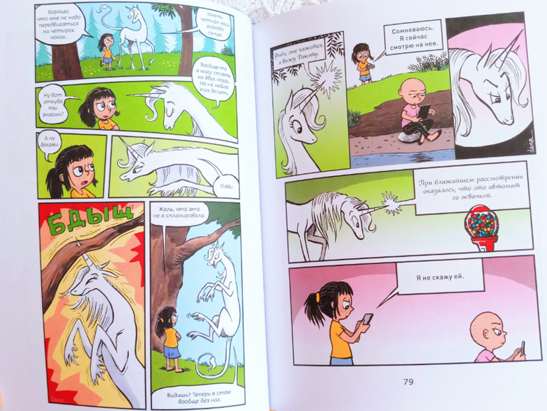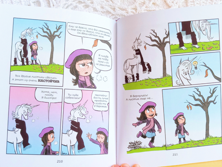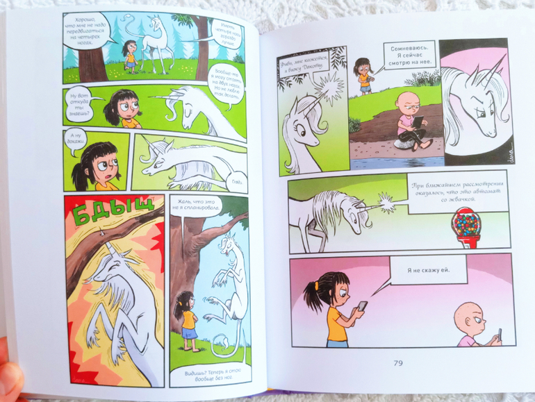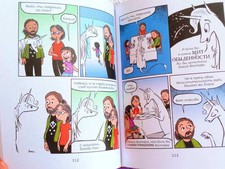 Следующая книга " Фиби и Единорог" .Это комикс. Кто не любит комикс? Дети обожают!!! Я помню свой единственный комикс про Скруджа))) Но моя мама не любила его читать😂. Мне читал папа и старший брат. Я обожала комиксы!!! Но сейчас я тоже не люблю читать комиксы.... Но все равно покупаю-- это уже четвёртая книга))) Читает муж))) Девочки очень любят, к тому же комикс про забавную , смелую и очень непосредственную девочку Фиби , про волшебного единорога и дружбу))))