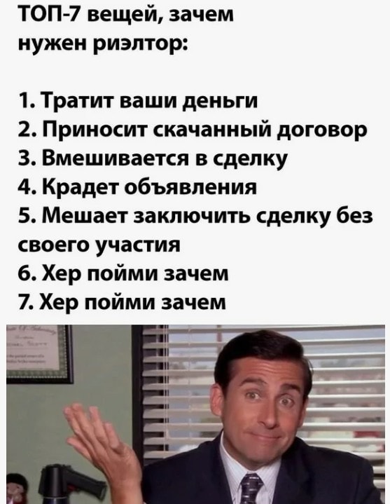 По моему опыту все ,что написано на картинке - правда ) Покупала квартиру , естественно во всех объявлениях отвечали риэлторы , а не собственники. С самого начала со стороны риэлтора была просто куча косяков, я сама юрист , поэтому знала что нужно спросить и где посмотреть. Договор был реально скачан из интернета, и это делал риэлтор , который, по его словам , в профессии более 20 лет 🤦‍♀️ в итоге , после моих очередных правок он сказал - если ты такая умная , договаривайся с собственниками сама. Собственники оказались тоже умными , за пару дней мы все уладили и подписали все документы. Риэлтор не сделал ровным счётом ничего , но получил от бывших собственников свою нехилую комиссию и ушел в закат. И это только один из личных примеров. Мой вывод однозначный - риэлторы - зло !