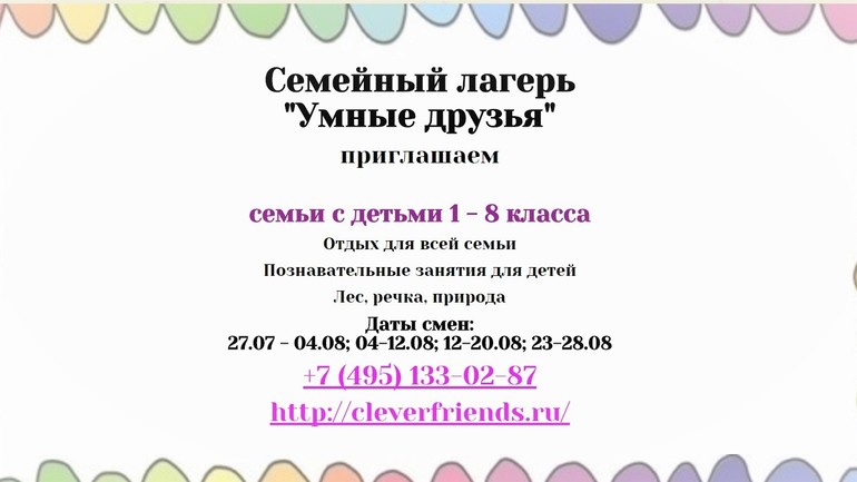 С УДОВОЛЬСТВИЕМ всем рекомендую лагерь "Умные друзья". Лагерь находится в Подмосковье (Звенигородская биостанция). Прекраснейшая территория, вкусная еда.
