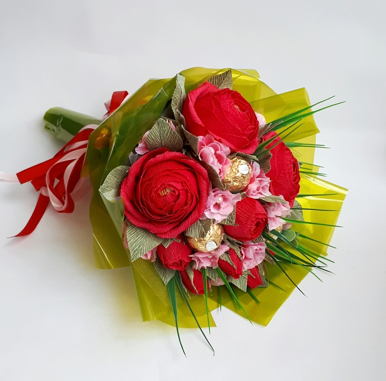 Букет упакован в корейской технике. Высота 40 см, диаметр 23 см. Конфеты Ferrero rocher 3 шт, Дольче мио 4 шт, Марсианка 6 шт. Цена 700 р Бесплатная доставка до любой станции метро. Самовывоз от метро Бунинская аллея.