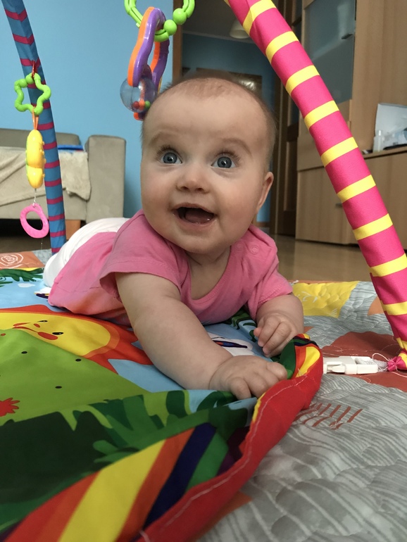 -крутится на животе на все 360 градусов, даже немного получается у неё перемещаться; чувствую, что скоро поползёт;