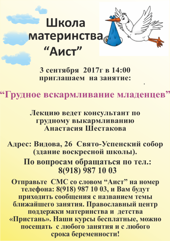 Анастасия Шестакова Адрес: Видова, 26 Свято-Успенский собор (здание воскресной школы). Отправьте СМС со словом "Аист" на номер телефона: 8(918) 987 10 03, и Вам будут приходить сообщения с названием темы ближайшего занятия. Православный центр поддержки материнства и детства «Пристань». Наши курсы бесплатные, можно посещать с любого занятия и с любого срока беременности!