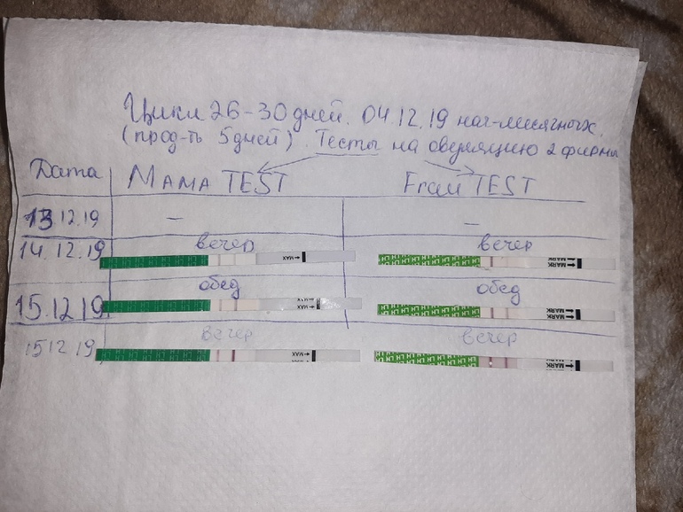 Очень хочу забеременеть. Решила в этом месяце отследить овуляцию с помощью тестов. Использовала при этом 2 вида тестов. Цикл 26-30 дней. Продолжительность менструации 5 дней.Прилаживаю фото результата. Посоветуйте когда стоит начинать действовать)