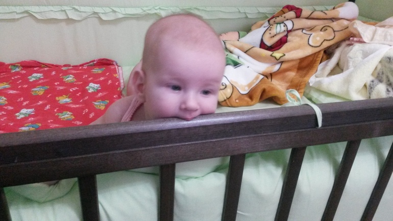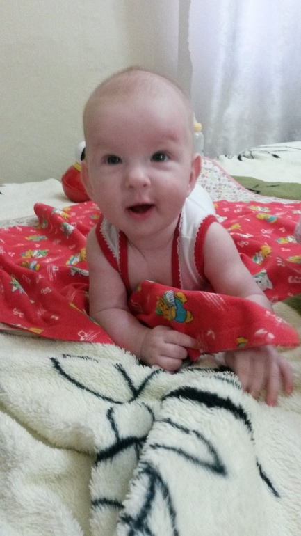 Поставили сегодня АКДС, пока полет нормальный. Смех стоит на весь дом. Спать как всегда нам некогда. Укладывается на любой сон сама, обнимаясь с пледом. Правда иногда смешинка нападает. Может час лежать сама себе веселая. Порой это жутко бесит. Но это лучше,чем если бы плакала и нужно было бы качать. Пытается вовсю вставать на четвереньки. Привстает и раскачивается. Папа наш хохочет, очень уж ему это половой акт напоминает( у кого что болит,видимо). Все время проводит в основном на животе(первый раз перевернулась 2 августа, за неделю до 3 месяцев). Очень любопытная и внимательная. Обожает наблюдать,как я мою посуду и глажу. Хм, ну надеюсь запоминает как что, чтобы маме быстрее помогать. Агукает уже редко( начала за пару дней до 1 месяца), в основном пищит и верищит. Любит играть с ногами, вовсю в рот тянет.Вообще Ника прям подарок. Тьфу-тьфу,не сглазить. Ночами спит, на ручки требовательно не лезет, сама долго может играть и плачет с самого рождения только по делу(кушать или спать).