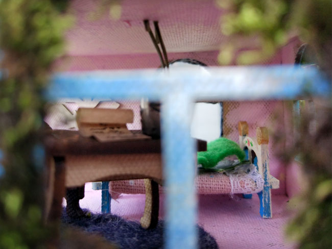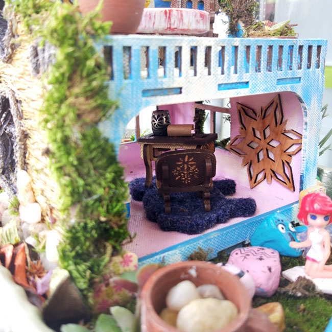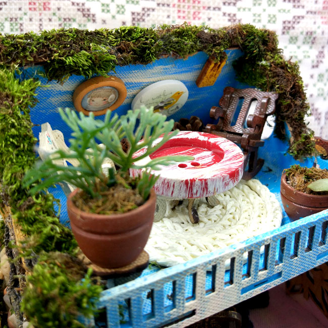 Открытая мансарда должна быть милой и уютной, а значит не обойтись без кресла-качалки и столика для вечернего чаепития, самотканого коврика и картин на стенах. Кто спонсор поставки мебели для домика феи? Конечно же, мой муж. Вся мебель сделана из электрокартона и раскрашена мной акриловыми красками.