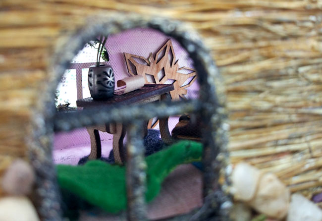 Вы когда-нибудь смотрели мультфильм японского режиссёра-аниматора Хаяо Миядзаки "Ариэтти из страны лилипутов"? Если вам нравятся добрые фильмы и прекрасные детальные картины, увлекающие за собой, то очень и очень советую. Так вот, я бесконечно могу любоваться обстановкой дома крошечных человечков, где на стенах вместо картин висят почтовые марки и пуговицы, печь сделана из цветочного горшка, а сама героиня закалывает волосы бельевой прищепкой и несётся навстречу приключениям. И мне хотелось, чтобы наша фея была такой же отважной, и чтобы её окружали не только малюсенькие, но реалистичные предметы мебели, а что-то и из нашей повседневной человеческой жизни. Так на стенах появились разнообразные пуговки и фурнитура вместо картин, столик тоже сделан из большой пуговицы, а вазочки - из бусин. Так бы могла обставить домик сама фея, если бы мы всё не сделали за неё . Но это же мы в конце концов приглашаем её погостить.