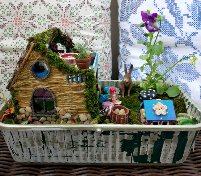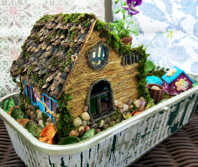 Кстати, сооружение домика для фей - популярное нынче занятие. Если ввести запрос в поисковике, можно просто черпать идеи ложкой. В зависимости от воображения и уровня умелости рук, люди строят для фей целые замки из пластиковых бутылок и стеклянных банок, втулок от туалетной бумаги и картонных коробок. Иногда получается такое чудо, что ужасно хочется превратиться в фею, собрать пожитки и переехать в эту картнонно-шишечно-соломенную милоту или хотя бы провести там лето.