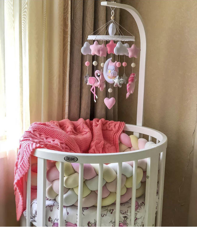Я все-таки остановила свой выбор на круглой кроватке, мне больше нравится как она вписывается в интерьер нашей комнаты, не занимает много места. Много плюсов для себя нашла) Вместо бортиков косичку положили, выглядит очень симпатично)