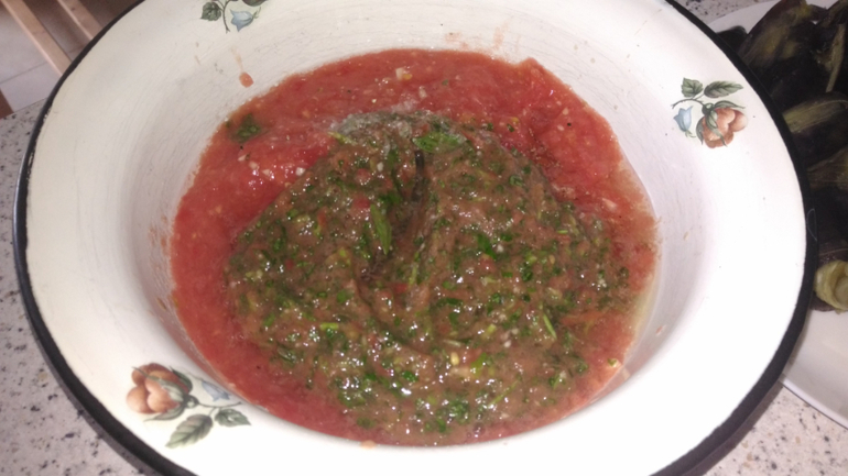 3. Помидоры, зелень и чеснок измельчит в чаще блендера, мясорубке и т.п.