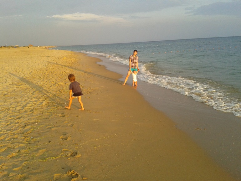 Выехали из Москвы в ночь, часов в 7 вечера. Просто потому, что так было больше шансов проехать больший отрезок пути пока дети спят. Так и получилось, ехали не торопясь, так как одним водителем. Я на заднем сидении развалившись с младшим, обложившись подушками и почти не вылезая у него изо рта, а старший на переднем сидении всю ночь спокойно проспал. Ехали спокойно, Ростов-на-дону пролетели без пробок, остановились позавтракать в прекраснейшей Вареничной и около 13-30 уже оформляли документы на заселение. Остановились на косе, на базе отдыха "Ростовчанка", оставшейся там еще с советских времен, обновленной и подштукатуренной. Сезон был уже почти окончен, так что народу почти не было и ценник был очень даже приятный. Эконом номера конечно не развернешься, две кровати, как в пионерском лагерном прошлом, пластиковый стеллаж, нано-холодильник и пузатый, ладно хоть не ламповый, телевизор... все это на пяти квадратных метрах. Душ и туалет общий... Но мы же туда не за комфортом ехали). Столовка - просто сказка, вкусно, полезно и много. Пляж - красота, большая песочница. Дети счастливы и заняты сами с собой, родители отдыхают.