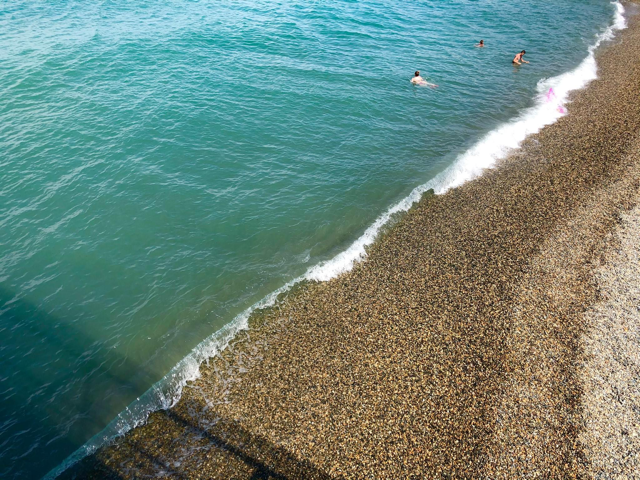 ???? В «Знании» четыре зоны пляжа, разделённые волнорезами. На самом дальнем участке, справа, галька очень мелкая. Когда волна откатывается назад в море галька делает «шурр, шуррр, шшшуррр». Этот звук убаюкивает и отгоняет все мысли- и умные и глупые. Иногда полезно « обнулять» голову.