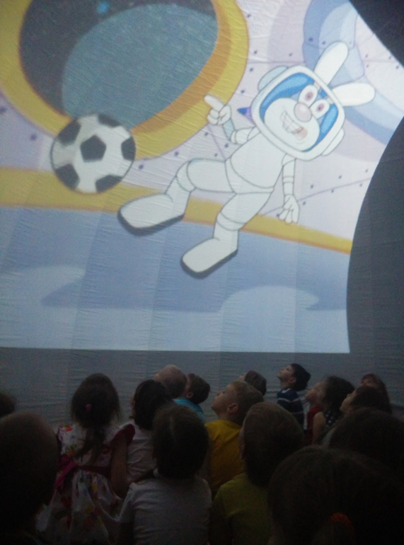 внутри проектор , ноутбук и акустика... дети залазиют туда, садятся ( можно даже лечь) , включается типа мульт истории про космос...