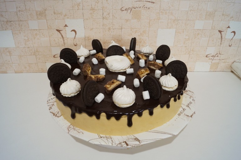 Делала по стандартному рецепту, но в середину добавила крем нуга с арахисовой пастой.