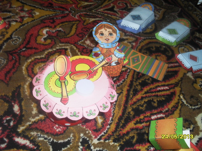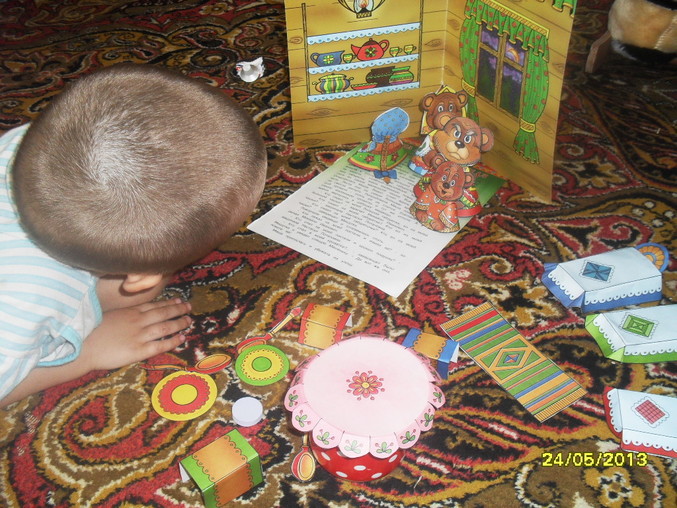 А сегодня я показала деткам спектакль, (если можно так сказать). Давно уже лежала у меня книжка с героями сказки "Маша и три медведя". Героев я заранее вырезала и поставила в укромное место, но детки заметили их уже утром. Итак, представление началось.