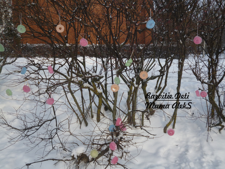 38. Украшения для улицы. Сделайте ледяные украшения, которые можно повесить на деревья во дворе или на площадке в детском саду. В плоских формах заморозьте подкрашенную воду или природные материалы, конфетти, кружочки апельсина, лимона или искусственные цветы. Опустите в воду концы ниточки или веревки, чтобы замороженные украшения можно было повесить на ветки. (Если позволит зима….хочется настоящей зимы). Что бы и на санках покататься и снеговиков слепить.
