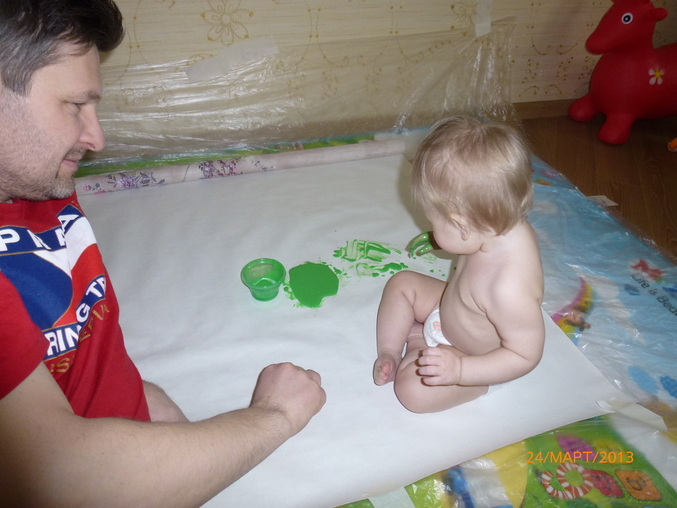Решила - пора дитя приобщать к прекрасному. Подготовилась фундаментально: расстелила пленку, закрепила малярным скотчем, чтобы не сбежала, раскатала обои, вручила краски.