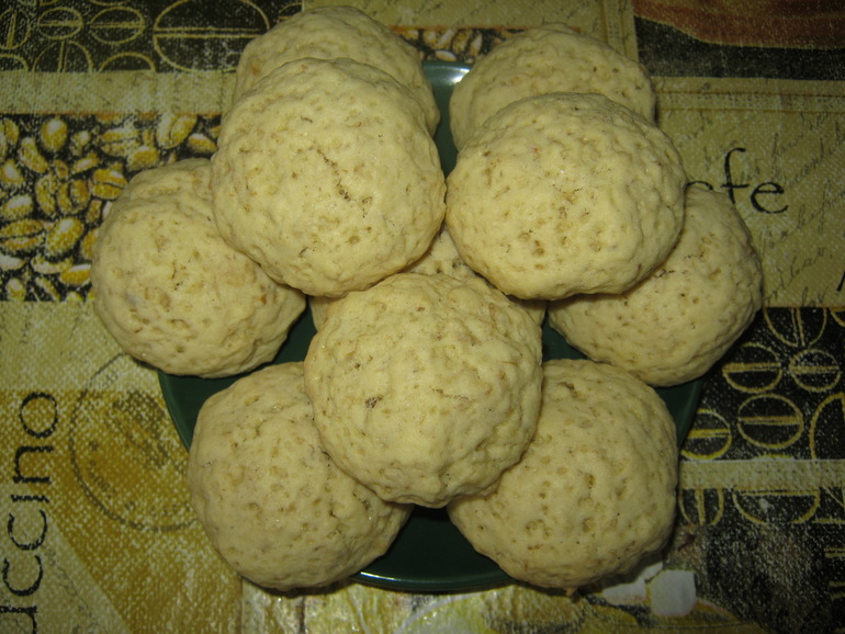Смешать сахар с мягким маслом. Добавить яйцо, хорошо все взбить. Добавить хлопья и специи, вымешать. Постепенно ввести муку. Сформировать шар, отщипывать от него маленькие кусочки, формируя шарики диаметром 3-4 см.