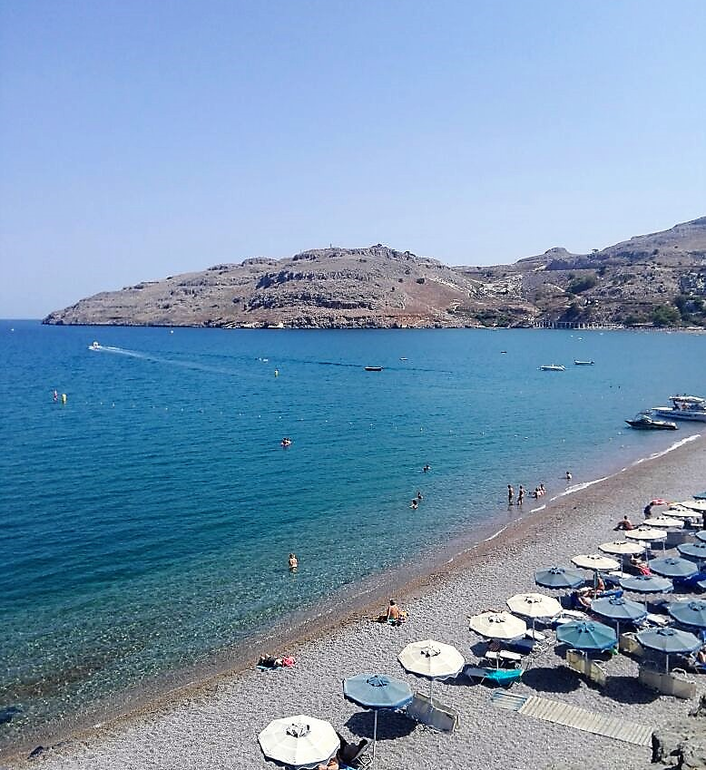 Находится отель на возвышенности, но очень грамотно продуманны лифты, я не ощущала подъемов, к пляжу спуск совсем несложный. Пляж общественный, 2 лежака + зонтик стоят 8 евро. Галечный и чистый. Родос омывается двумя морями, мы были на Средиземном оно спокойное, волн можно сказать не было, чего не скажешь о стороне где Эгейское море.