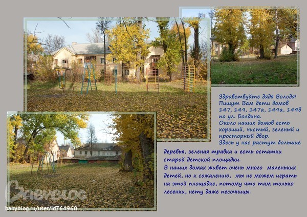 Девочки огромная просьба, кому это будет не сложно, проголосуйте за нас в конкурсе на установку детской площадки во дворе, там не нужно никаких регистраций и чего либо еще.