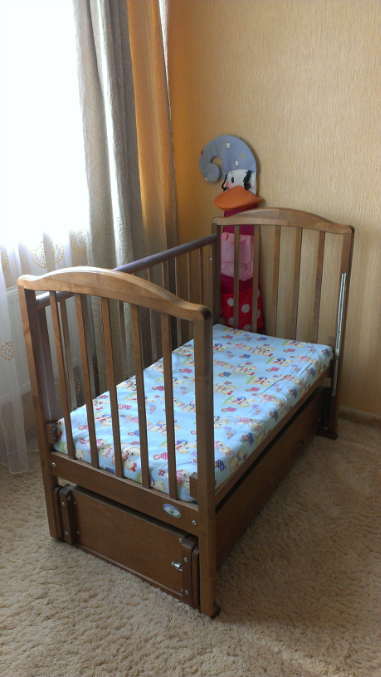 Ортопедическое ложе кроватки регулируется по высоте в двух положениях.