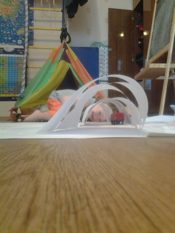Достижения сынули)Как то Дима мне сказал, что будет строить эстакады и тоннели для машин. Вот мы и потренировались. Построили первый в его профессиональной карьере тоннель)))).