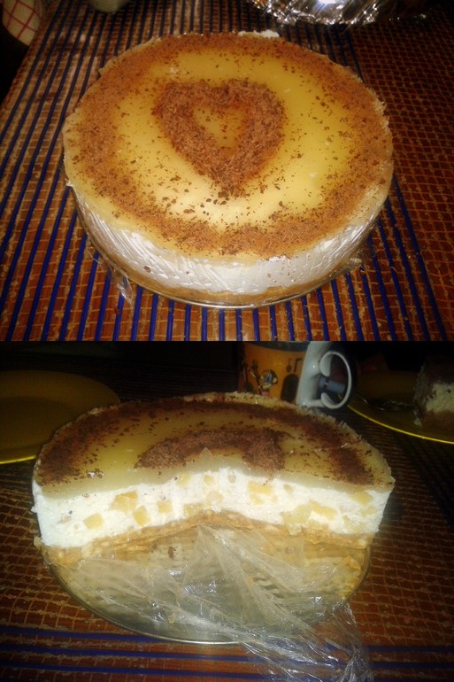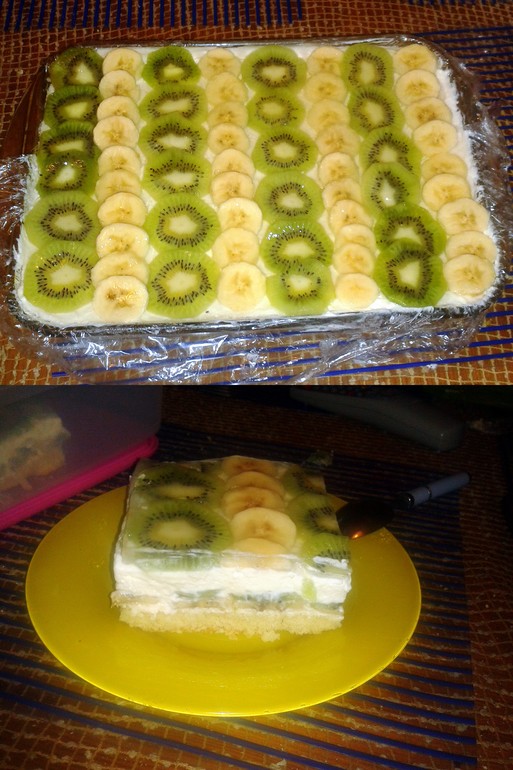 Выложить корж в форму,залить кремом и поставить на ночь в холодильник.