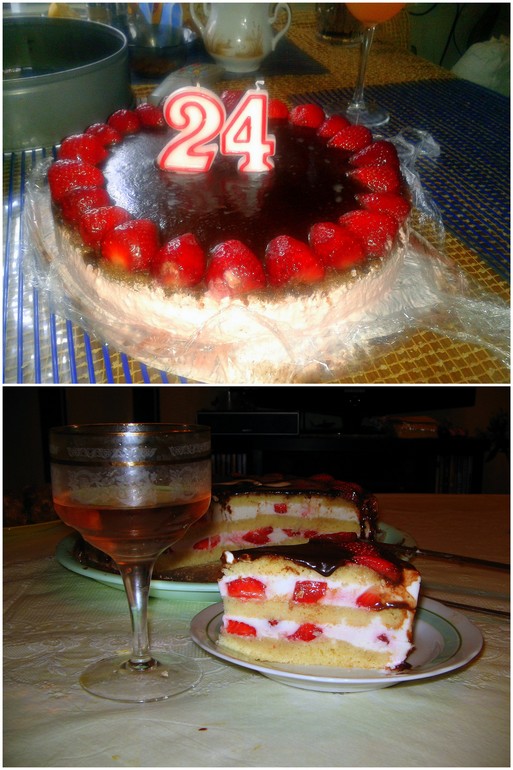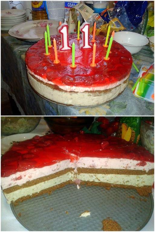 Клубника и банан на шоколадных коржах (двухслойный,разделила творожный слой на 2 части,в один добавила пюре из банана,в другой пюре из клубники)
