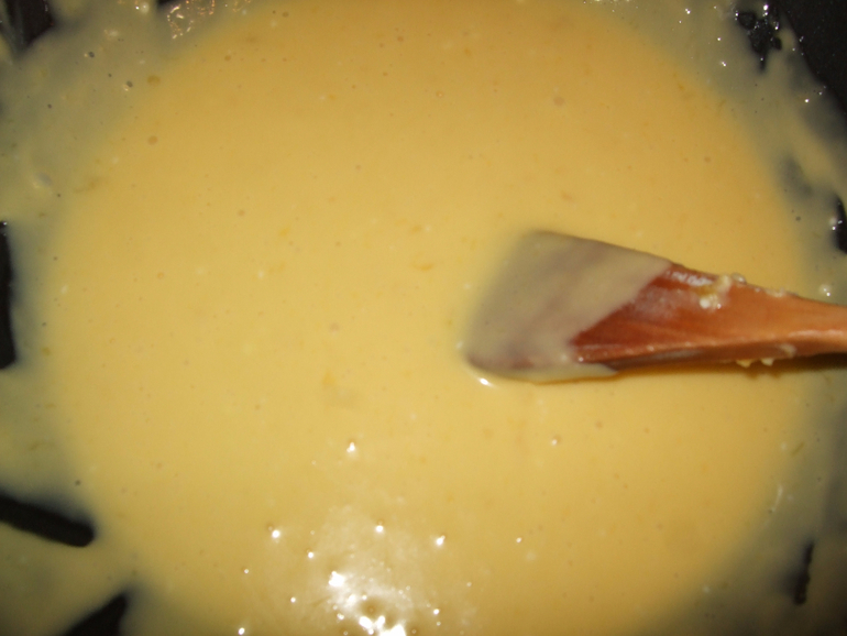 Варить нужно в непригораемой таре,у меня глубокая сковородка с антипригарным покрытием.Постоянно помешивая,на медленном огне варить минут пять.Если мешать не будете всё пригорит быстро и будут комочки.