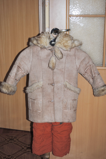 Дубленка для девочки на 3-4 года. Отдам вместе с тепленькими штанишками на лямках. 500р.!