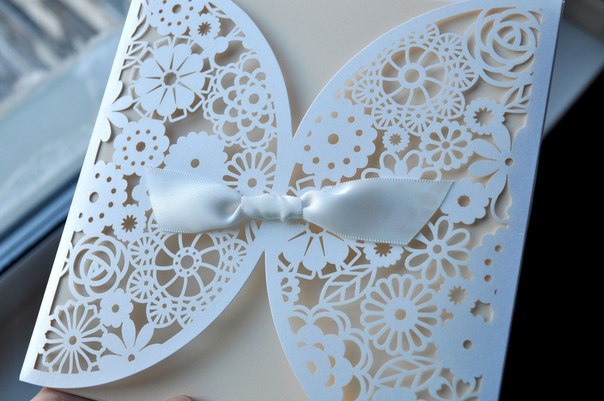 1. Первые выполнены в виде кармашка, куда вставляется вкладыш. Приглашения с кружевной лазерной резкой. Бумага с перламутром + атласный бант. В комплекте идет конверт и вставка в три сложения и наклейка для конверта.