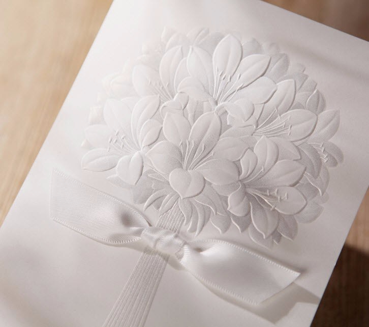2. Приглашение в виде книжки. Картон матовый, объемное тиснение в виде букета невесты переливается перламутром + атласный бант. Внутри есть вкладыш для текста. В комплекте идут конверты, вкладыши + наклейки для конверта.