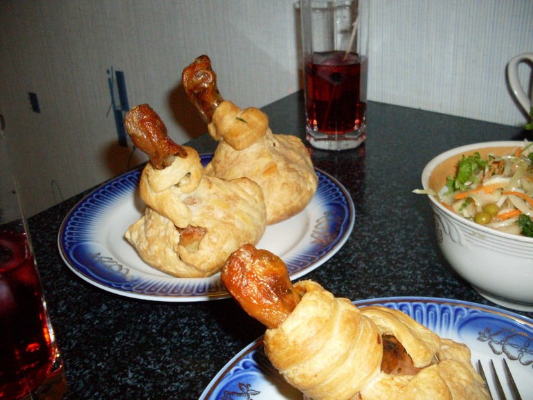 захотелось чего то вкусненького...а готовить ,лень,промариновала ножки в соев.соусе с прован.травками -на жарку в мультю мин на15,чуток остыли ,обмотала слоен.тестом ,в духовку до красивой корочки.