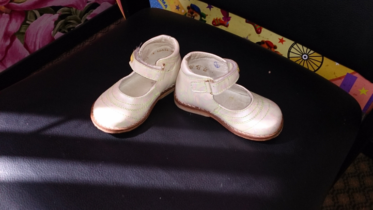 5. Перламутровые туфли фирмы Котофей, размер 21, носили мало, но испачкали подошву на детской площадке в краске, сверху ничего нет, изготовлены полностью из кожи - 500 руб
