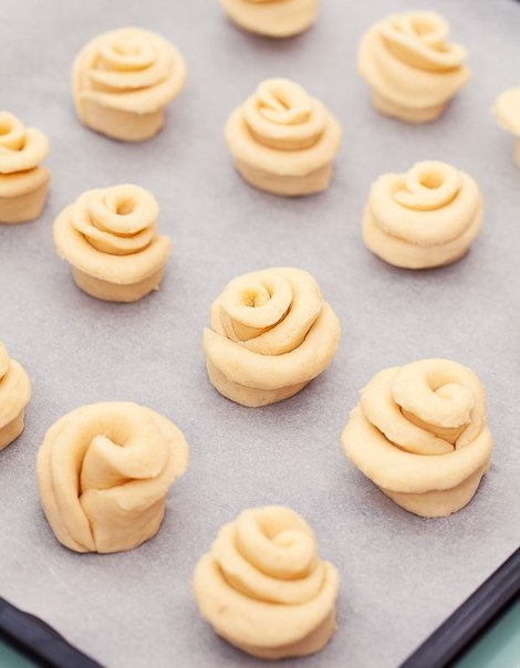 3. Застилаем пергаментом (или силиконовым ковриком или просто смазываем сливочным маслом) противень. Выстраиваем на нем розочки.