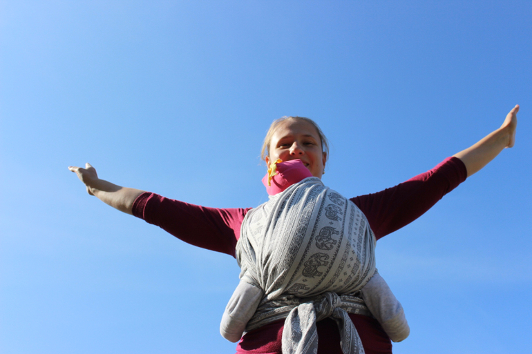 И, наконец, берем слинг на прогулку. Упаковываем младшую. И вот тут уже понимаю, что в данном случае плотность и пухлость шарфа скорее минус - жгуты под ножками мне кажутся слишком объемными, на плечах лежит не очень удобно, многовато ткани, ну и узел конечно, большой. И да, я люблю тонкие шарфы.