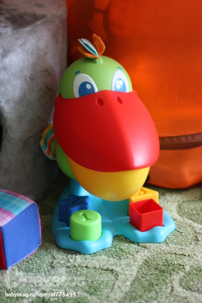 черепашка на полянке.Наливаем водичку в цветочек справа крутится цветочек и по бокам внизу как весы поднимают листочки черепашки,грибочик пищит если нажать,а бабочка для мыльных пузырей.Любим посидеть поиграть с ней)