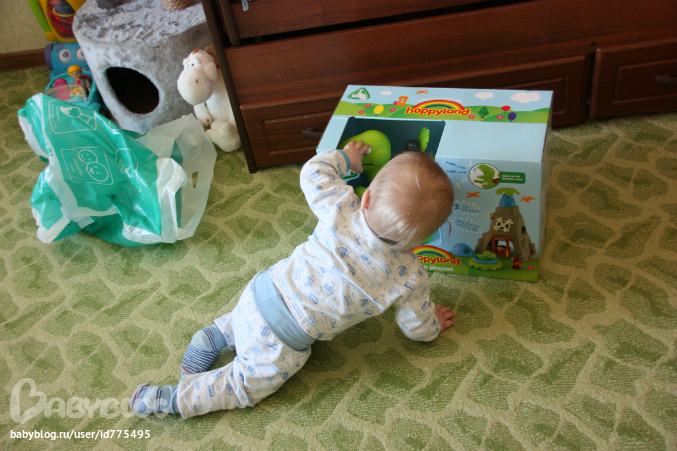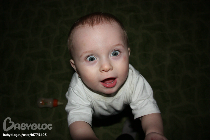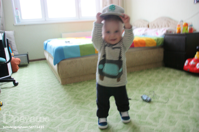 сегодня первый раз пошли гулять в ботинках,да и вообще это наша первая обувь.Так не уклюжа перебирал ножками,но улыбался(понравилось).Увидели малыша(чуть больше годика ему) начали переговариваться да и с таким серьездным видом.Пришли домой и давай опять в мячик играть(любимое дело),ходит(сами то мы не ходим)взявшись за рукчи и по мячику ногой как даст,догоняет и снова,и так играем минут 20 пока мама не устанет))