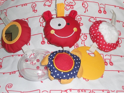 В наборе к качелям идут погремушка,прорезыватель и игрушка с пищалкой.
