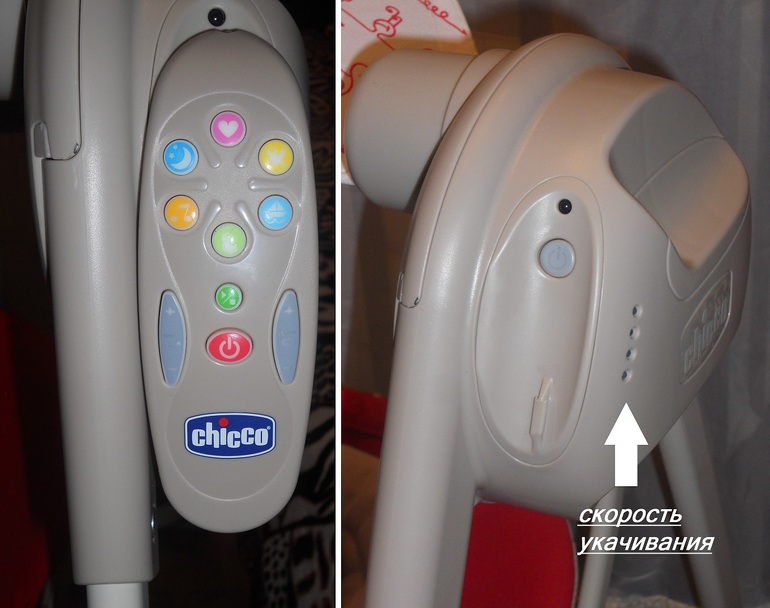 И конечно немного об электронике. Качели снабжены пультом управления,на котором находится кнопки "включения" , "выбора темпа качания"(4 скорости),а так же кнопки выбора звуковых эффектов.Можно включить один из 6 музыкальных режимов таких как: звуки моря,биение сердца,колыбельная,пение птиц,весёлая бодрая музыка,и стрекотание цикады.А на сиденье есть включение вибрации.