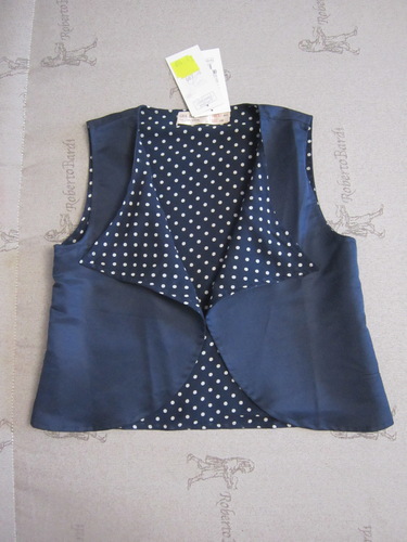 Новый стильный атласный темно-синий короткий жилет GJ 10-12л. (до 152р-ра), Внутренний синий подклад - в белый горох. 200р. распродажа (стОил 699р.).