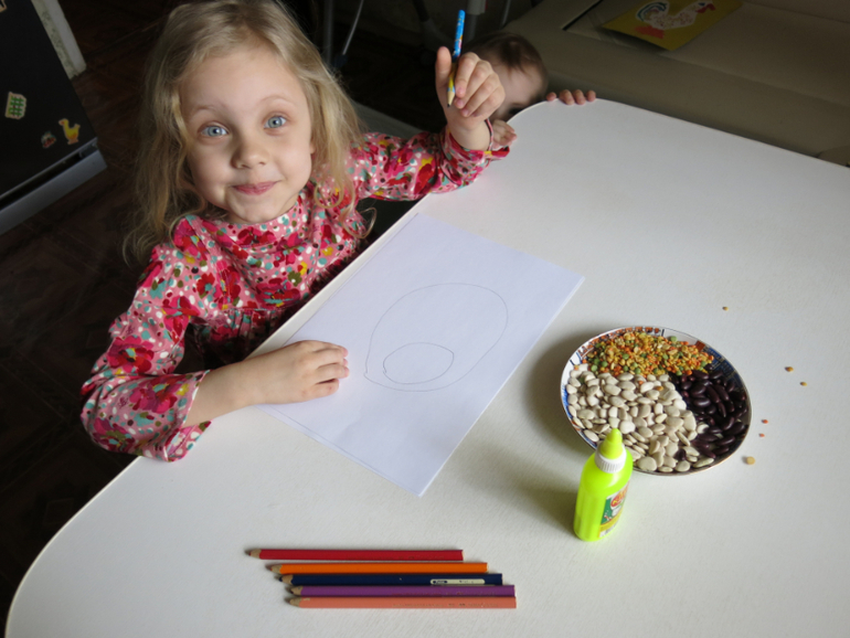 Затем на этот клей по контуру выкладываются запасенные бобовые, и шедевр готов!