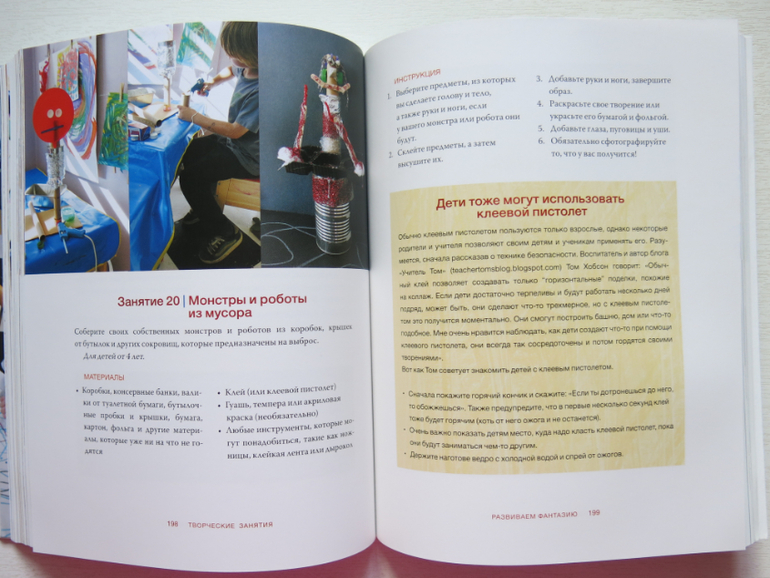 - Развиваем фантазию. А до этого раздела дойдем не скоро. Здесь предлагается сделать что-то посложнее - поработать с глиной, смастерить шляпы для карнавала или плащ супергероя в стиле батик, трехмерные витражи или монстра из мусора.