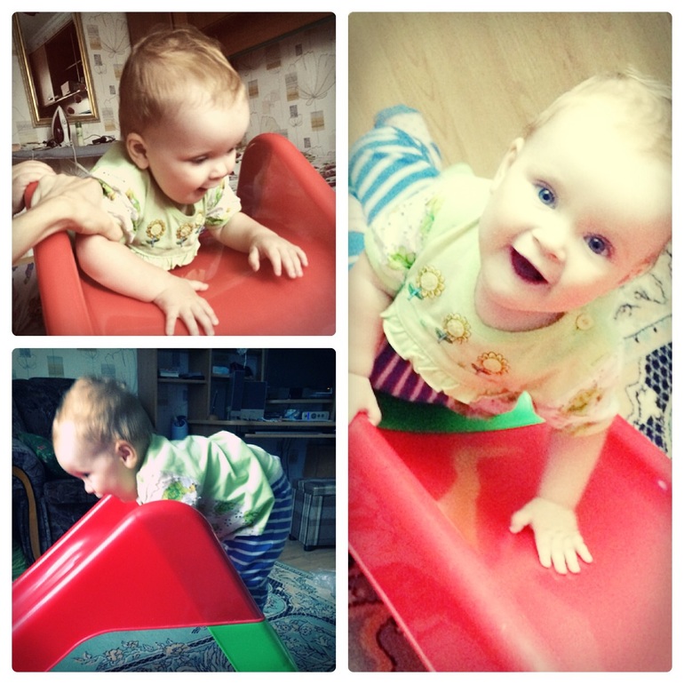 А тут я ей на днях показала, что с нее кататься прям можно. Так теперь у нее целая система- поднимается по ступенькам, наверху начинает мешкаться- ноги то не слушаются)) я ей ножки из под нее выправляю и она отталкивается- катится с горки. Потом ползет опять к ступенькам и поновой))))