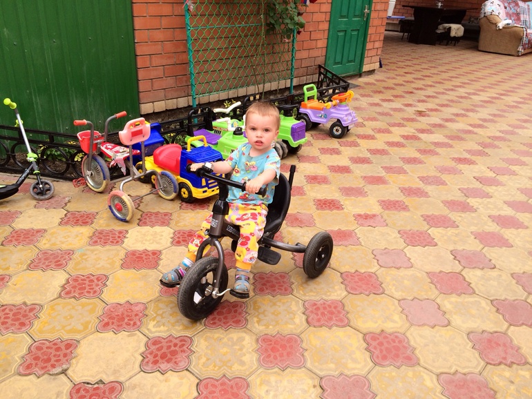 Кирюха научился ездить задом на велике, даже разворачивается , сдавая назад. Еще раз гоняется и ноги задирает))